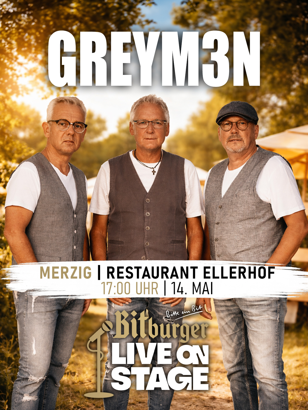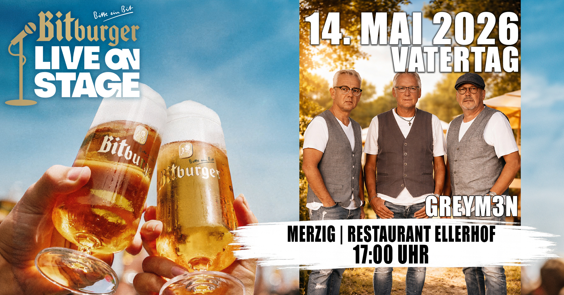 Bitbruger "Live on Stage" am 14.05.2026 mit der Band GREYM3N in unserem Biergarten. Der Eintritt ist Kostenlos.
